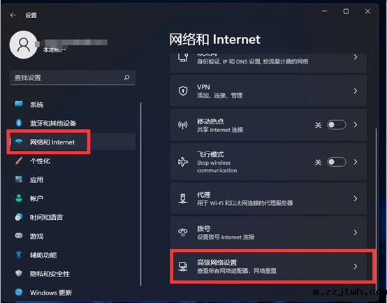 第二步、打开后,在左侧选择网络和Internet选项,再在右侧的最下方找到高级网络设置。