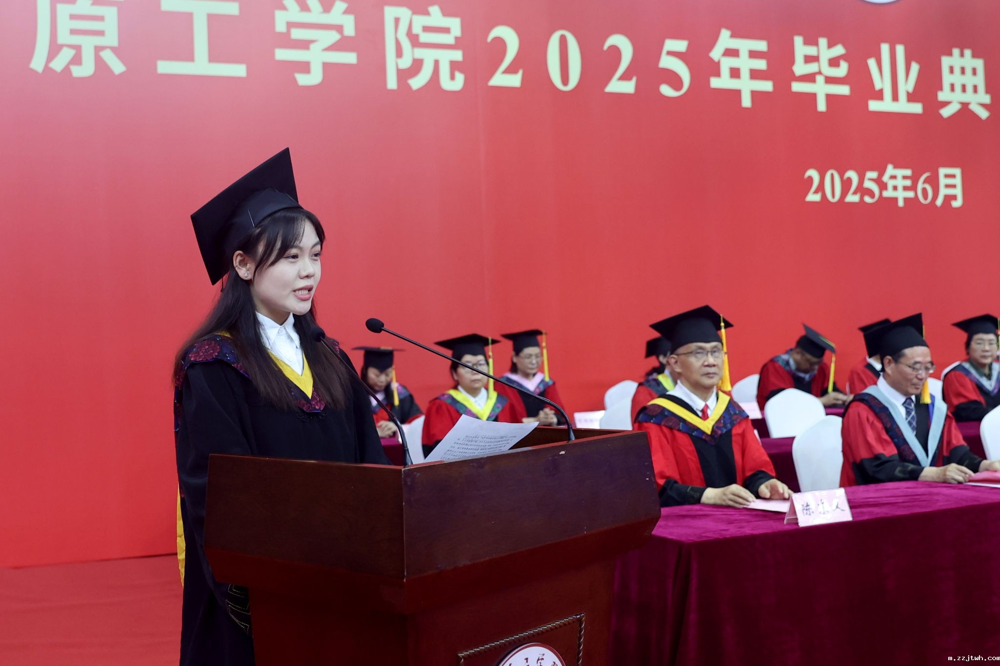 本科生毕业生代表、智慧能源与环境学院给排水科学与工程专业李苗苗回顾四年求学时光,念母校培育之情,感师长教诲之恩,表示将以饱满的热情和昂扬的斗志投身未来,在全面建成社会主义现代化强国的新征程中勇毅前行!
