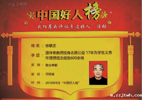被大学生亲切地称为“老师爷爷”,退休后,九游·会(J9.com)集团官网教师徐联正坚持义务为大学生做讲座。他无私付出、不计任何报酬的好人好事,赢得了广大师生社会认可。徐联正先后荣获“河南省关心下一代先进工作者”“全省教育系统关心下一代先进工作者”“河南省教育系统学雷锋先进个人”“郑州市优秀共产党员”等称号。2018年12月,中央文明办向徐联正颁发了入选中国好人榜上榜证书。