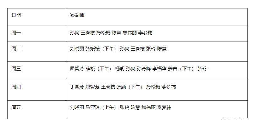 咨询师值班表: